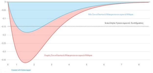 Η διακοπή της οικονομίας, ακόμη και για μικρό χρονικό διάστημα, προκαλεί σημαντικές ζημίες. Φανταστείτε ότι, σε σχέση με μια γραμμή βάσης, οι κατασταλτικές πολιτικές μείωσαν την οικονομική δραστηριότητα κατά 40% για δύο μήνες, μετά τους οποίους η οικονομία επέστρεψε στην γραμμή βάσης. Μια τέτοια απότομη αλλά βραχύβια πτώση θα κατάφερνε ένα ισχυρό πλήγμα στην οικονομική δραστηριότητα, οδηγώντας σε μείωση της ετήσιας αύξησης της παραγωγής κατά περίπου 6,5% σε σχέση με το προηγούμενο έτος. Φανταστείτε ότι χρειάζεται ένας ακόμη μήνας για να επιστρέψετε στην γραμμή βάσης, και η μείωση της ετήσιας αύξησης της παραγωγής φθάνει το 10%.