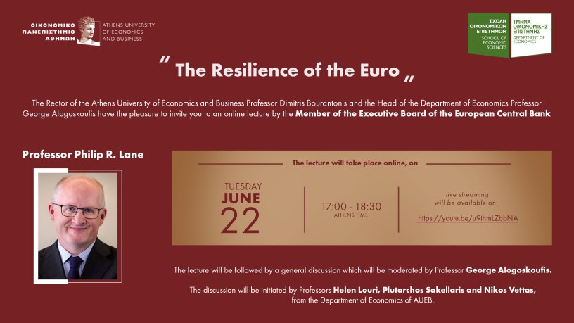 Το Τμήμα Οικονομικής Επιστήμης του Οικονομικού Πανεπιστημίου Αθηνών διοργάνωσε μια διαδικτυακή διάλεξη από τον Καθηγητή Philip R. Lane, Μέλος της Εκτελεστικής Επιτροπής της Ευρωπαϊκής Κεντρικής Τράπεζας, με τίτλο,